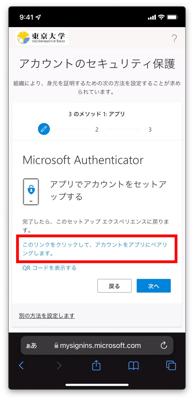 6. 「セキュリティ情報」と書かれた多要素認証の設定ページが表示されればOKです.