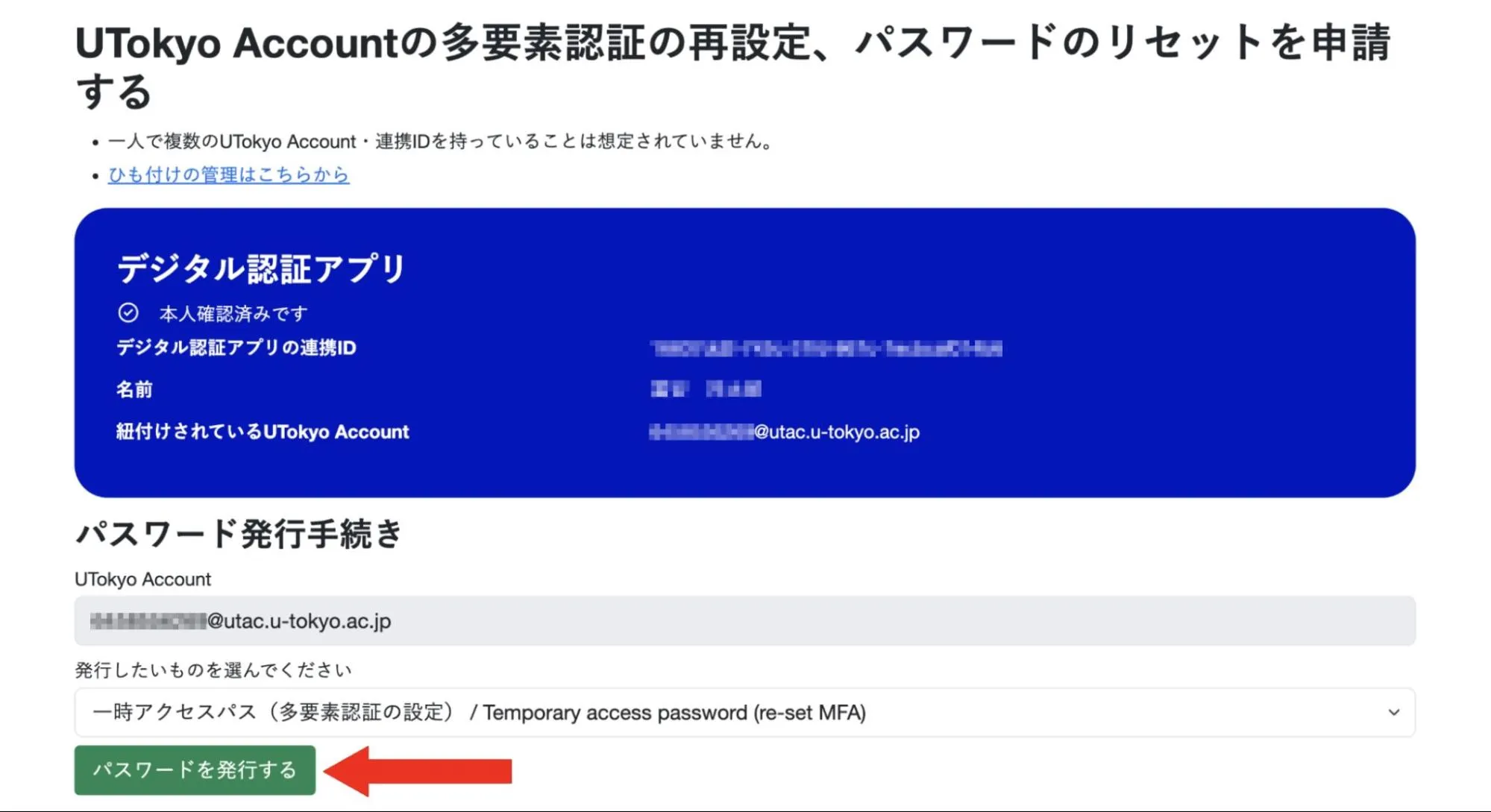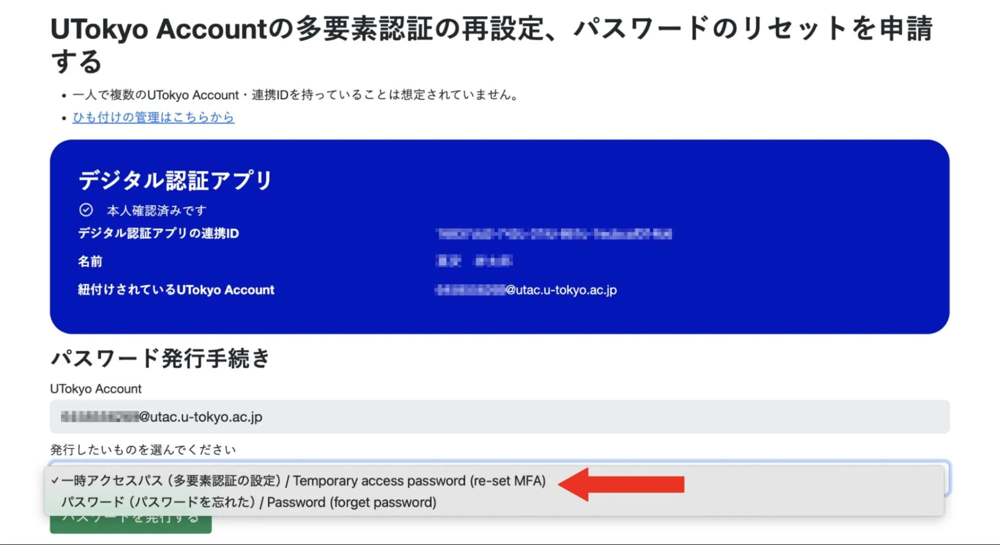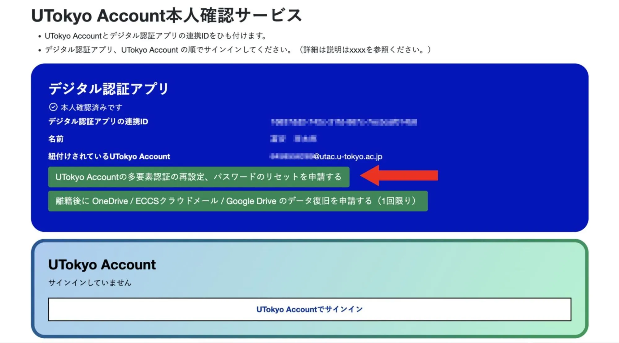 3. 「UTokyo Accountの多要素認証の再設定、パスワードのリセットを申請する」を押してください.