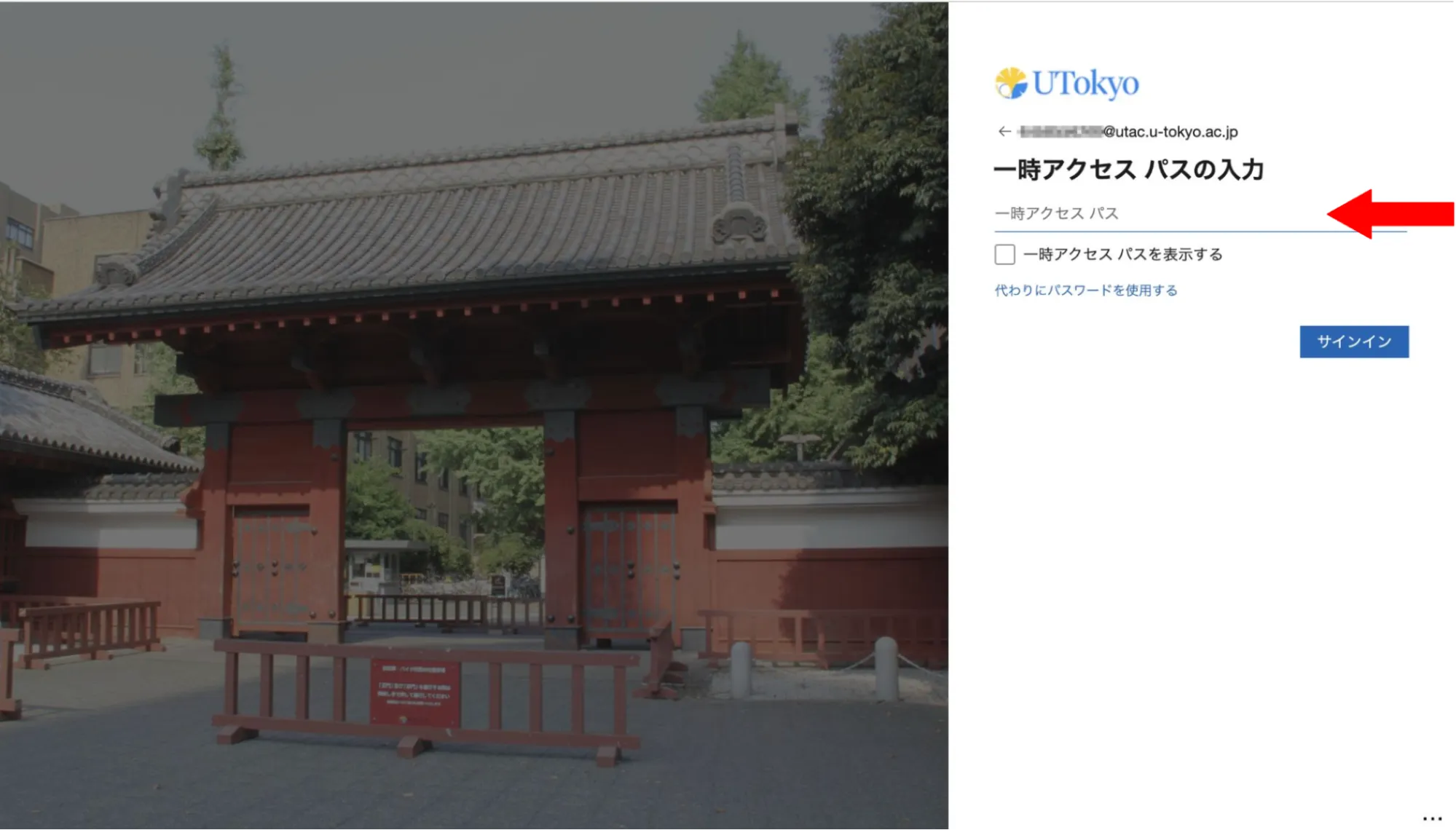 7. サインインを要求されるので,IDに自分のUTokyo AccountのID,パスワードに先ほど発行された一時アクセスパスを入力し,サインインしてください.
